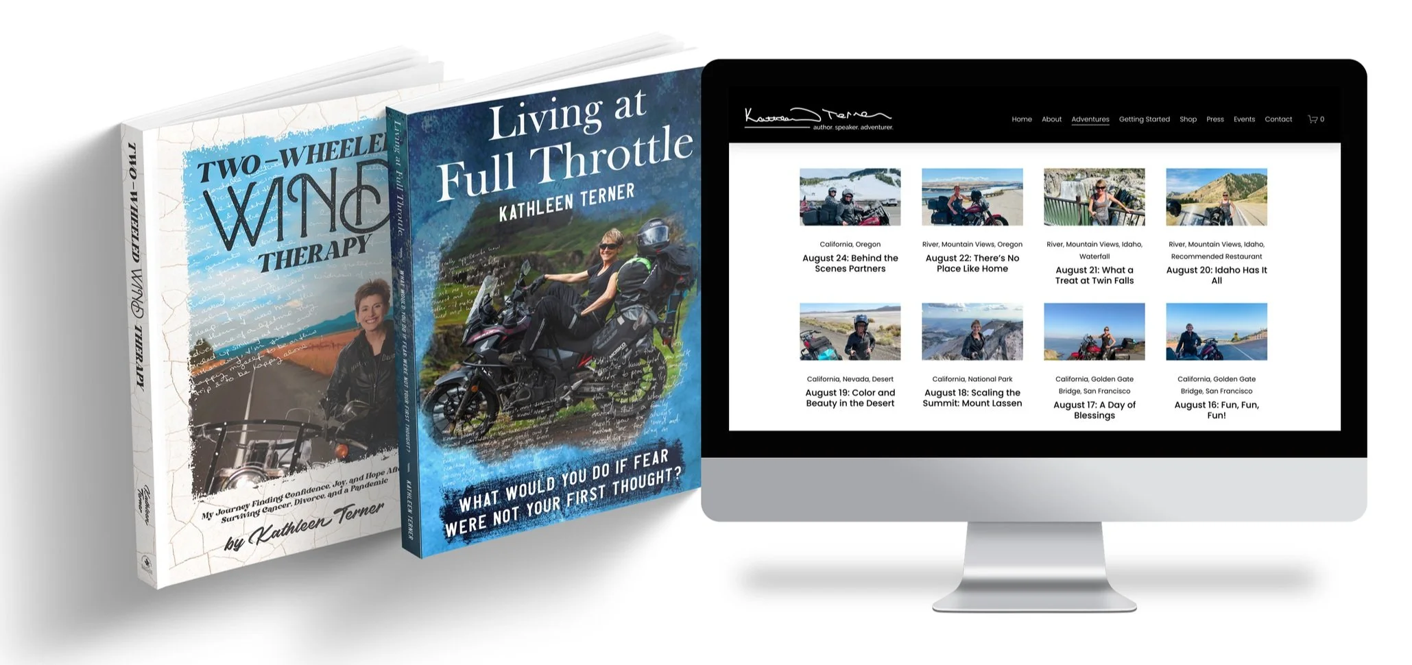From the blog that started it all to her acclaimed memoirs, Kathleen’s writing has inspired people across the world to “Live at Full Throttle.” Follow along with Kathleen as she travels over 100,000 miles through twenty four countries, sharing vivid descriptions of delicious food, curvy roads, and natural wonders along with humorous and heart-warming descriptions of mishaps and personal encounters along the way. Order your signed copy of “Two-Wheeled Wind Therapy” or “Living at Full Throttle” today to learn more about the motorcycle trips that helped Kathleen learn to face her fears and see herself as a person of strength and value.