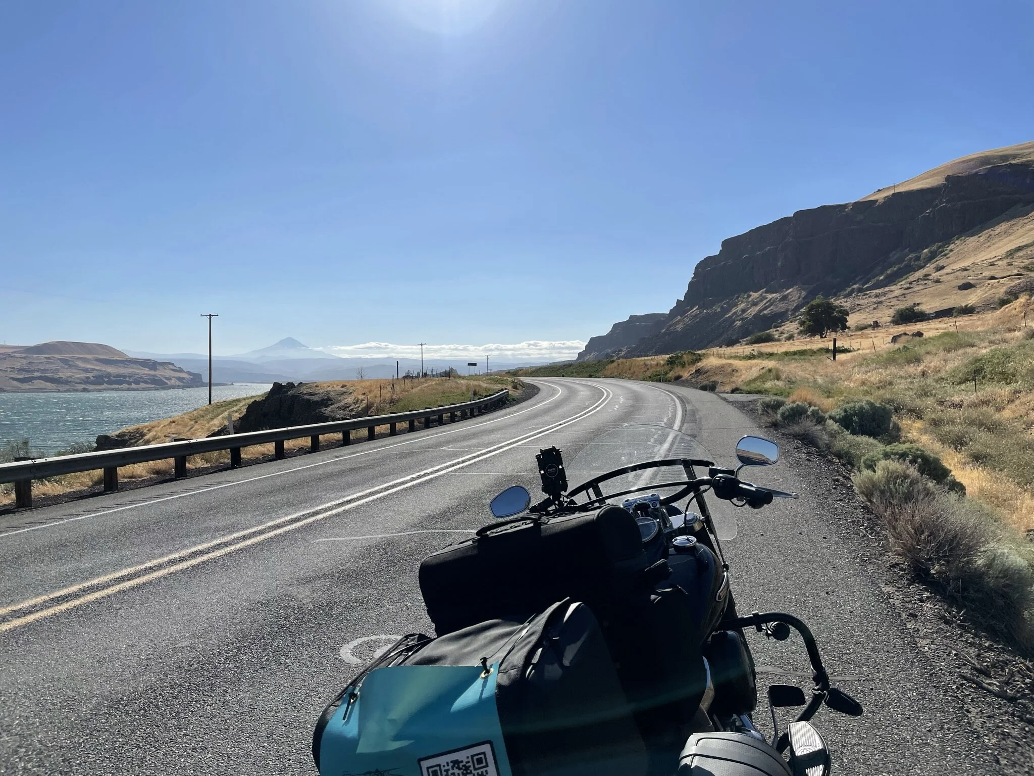 Getting on the bike after lunch, I was so excited to be coming home to my children and also to be riding along the Columbia Gorge. I love both the north and south routes along the Gorge but started out on highway 14 on the north side today since it is a little more sheltered from the wind. I was captivated and delighted with the familiar shimmery blue waters of the Columbia River, the sparkling white clouds in the blue sky, and the brown and red cliffs and hills.