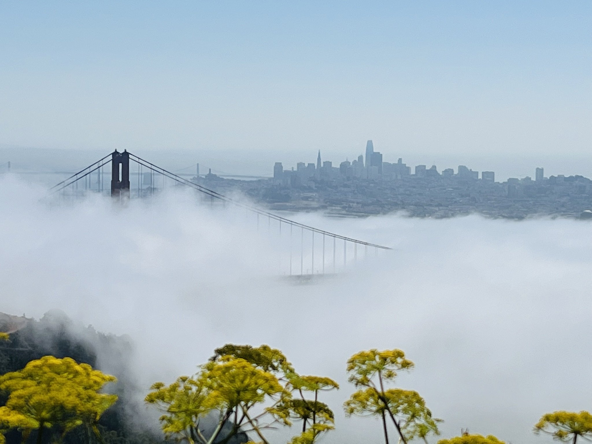 Before heading north, I couldn’t resist driving up to Hawk’s Hill in the Marin Headlands for another trip on the Conzelman Road loop. Bombing up Mccullough and then Conzelman Road, I was struck by the awe-inspiring sight of the Golden Gate Bridge resting in a bed of fog in front of the city of San Francisco with blue sky shining down on both. Wow! I gazed in rapt admiration as I watched cars on the bridge emerging from the mist and heard multiple ships blasting their fog horns in the bay below.