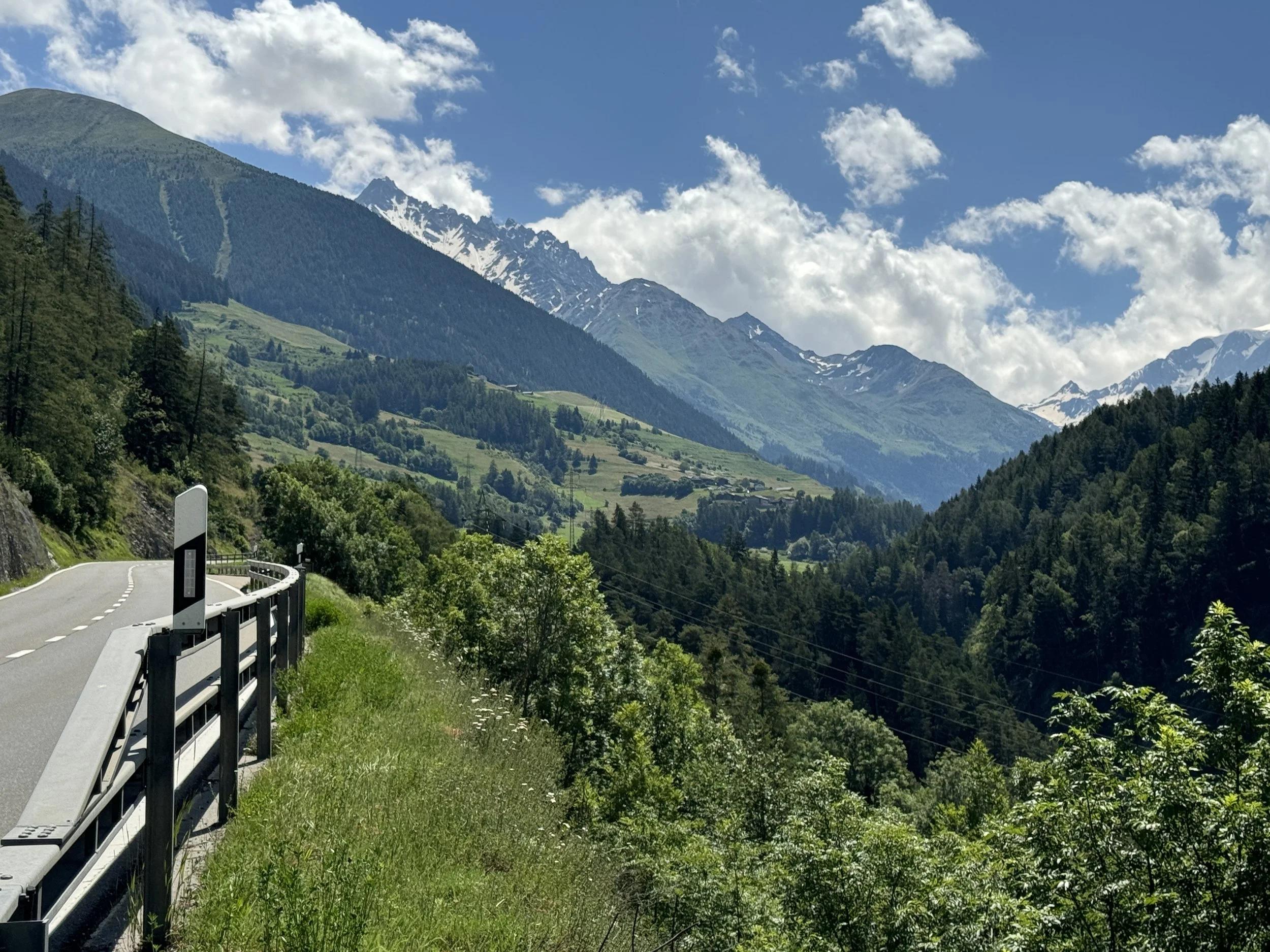 Due to some recent vision problems that have affected my depth perception and peripheral vision, I chose a route over the Swiss and Italian Alps that would give me spectacular mountain views but not be more technical than appropriate given my condition.