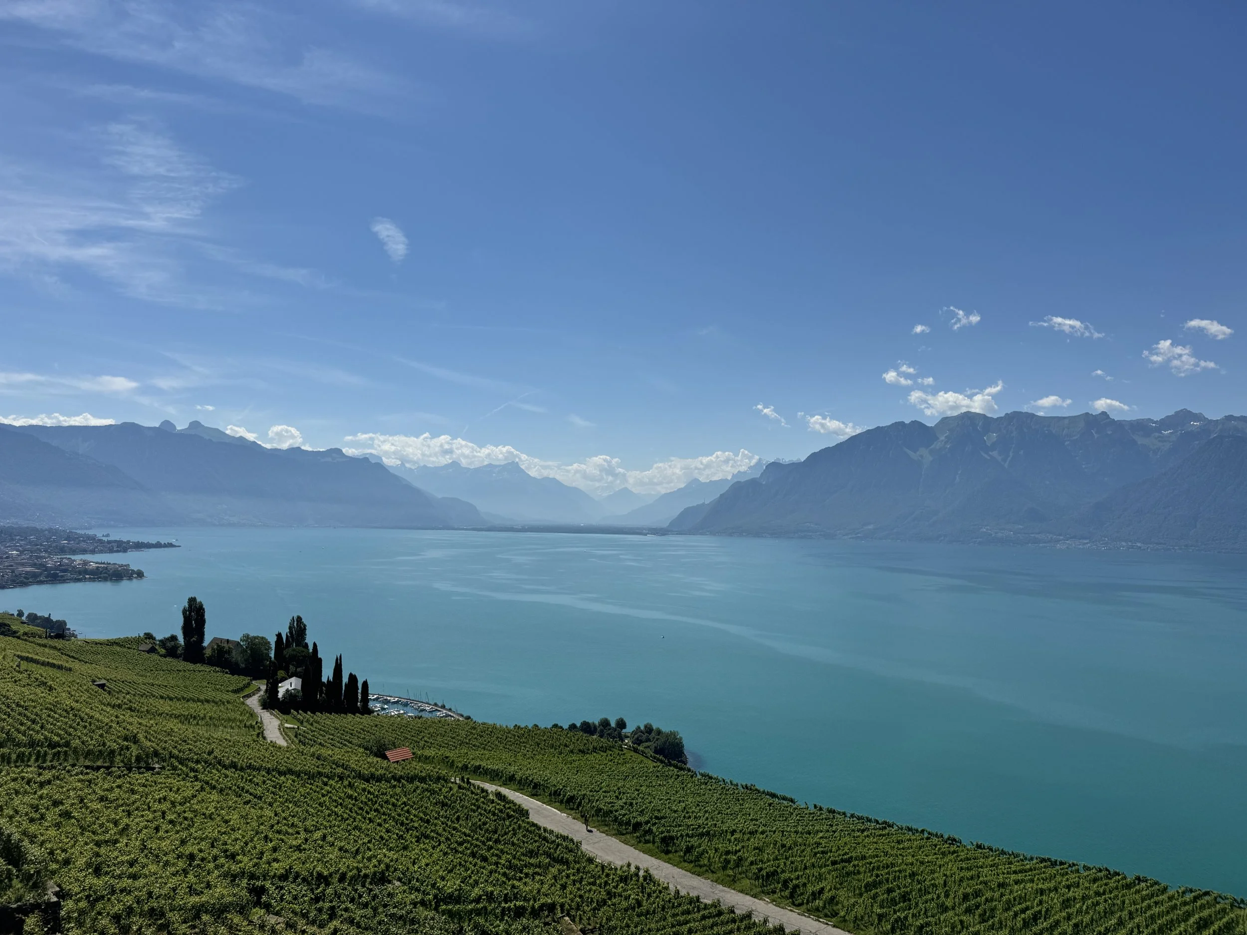 Then, when I headed east along Lake Geneva and got my first glimpse of the far end of the body of water, my heart leapt with joy! I can think of only one other time I have seen such a stunning lake view – the still, shimmering aquamarine surface was framed in the foreground by lush green neat rows of vines and beyond by rough craggy granite mountains topped by snow. Although traffic was heavy, I simply couldn’t resist pulling over to capture a little of the grandeur of the vista before me.