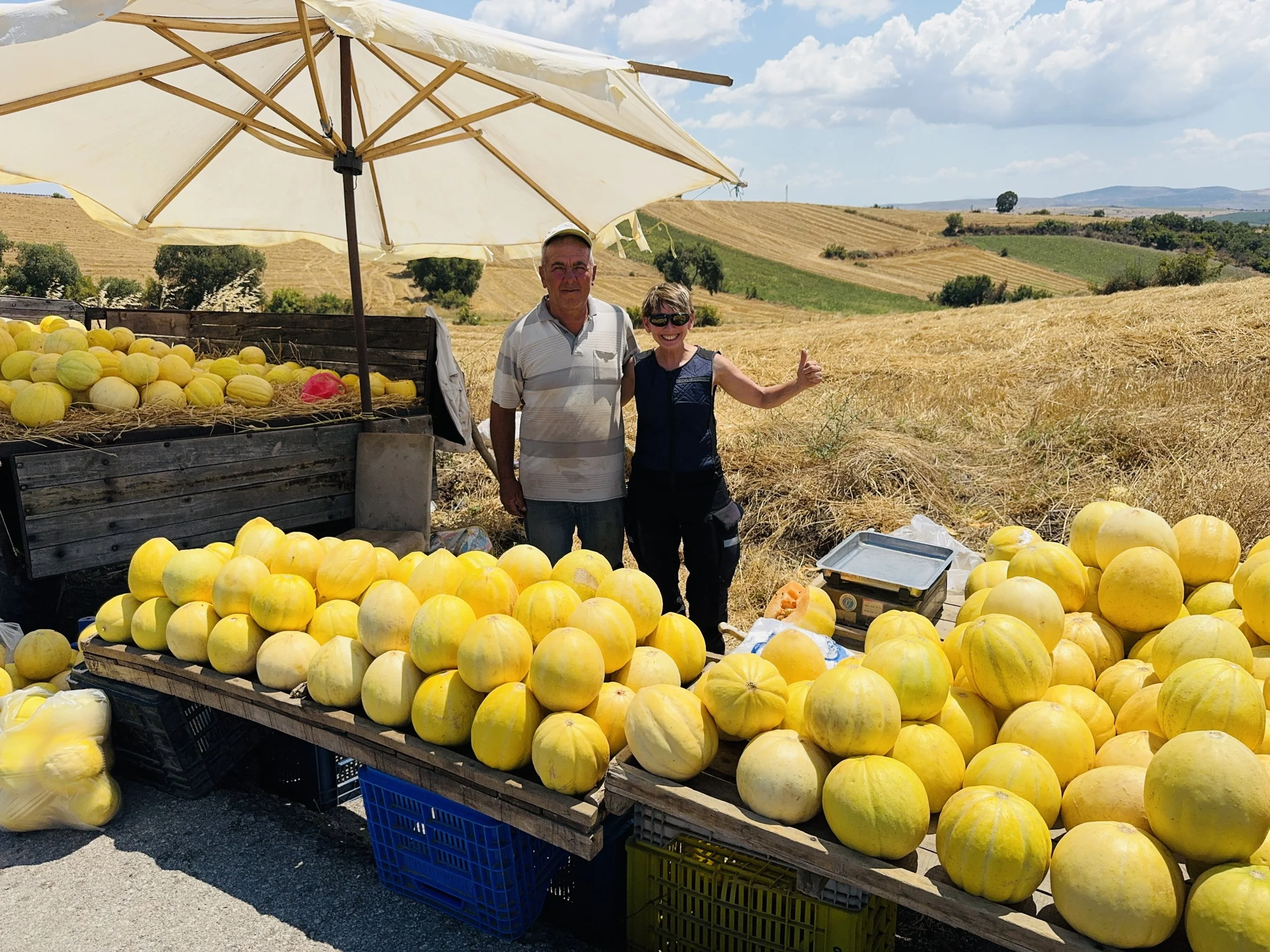 In Turkey, a farmer on the side of the road was adamant that I try a slice of his white melon. Although I don’t normally buy such bulky items while on the bike, I offered to purchase one of the luscious fruits because they were so moist and flavorful. He surprised me by bagging up one and not allowing me to pay him anything in return.