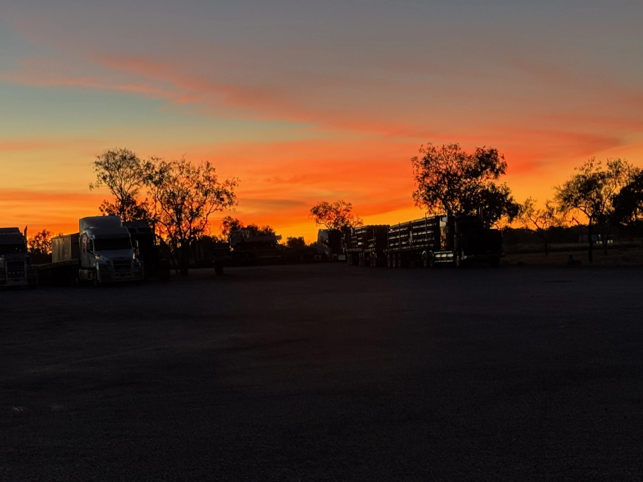 Walking down the rust-colored gritty dirt road from my room to the main building for dinner, I stopped in my tracks to gaze at the spectacular sunset – vivid hues of red, orange, and yellow right below the remaining pockets of baby blue sky. Tall eucalyptus trees and several large road trains parked next to them cast striking dark silhouettes against the amber backdrop.
