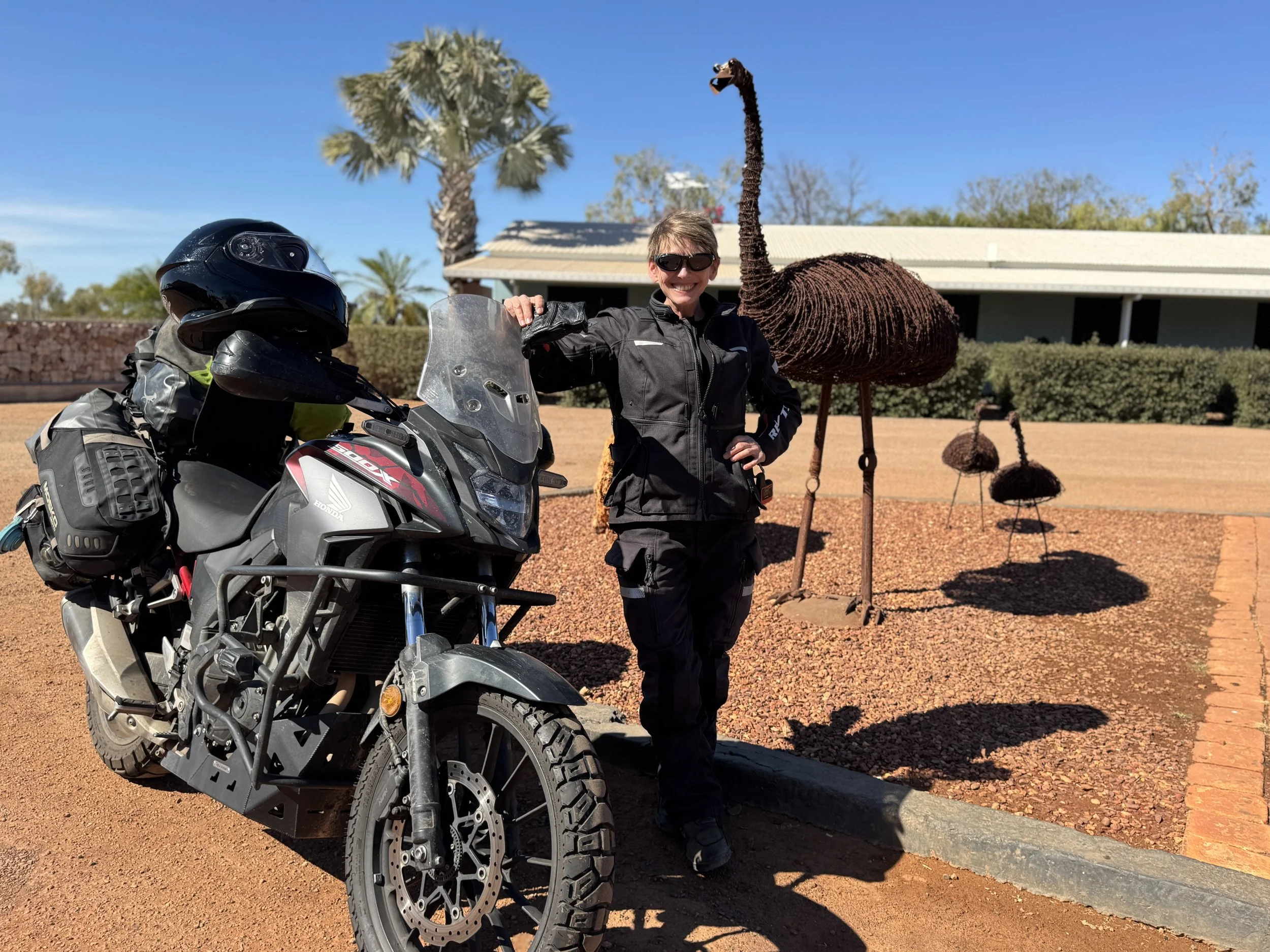 The homestead itself was more like a retreat in the desert than a roadhouse, complete with beautiful flowering trees, inviting benches on a large front porch, red-tailed black pet cockatoos, and decorative statues. I posed with Adventure Baby next to a metal sculpture of a large emu with two chicks in tow, hoping that would be the closest my bike would get to one on this trip, given my earlier near miss.