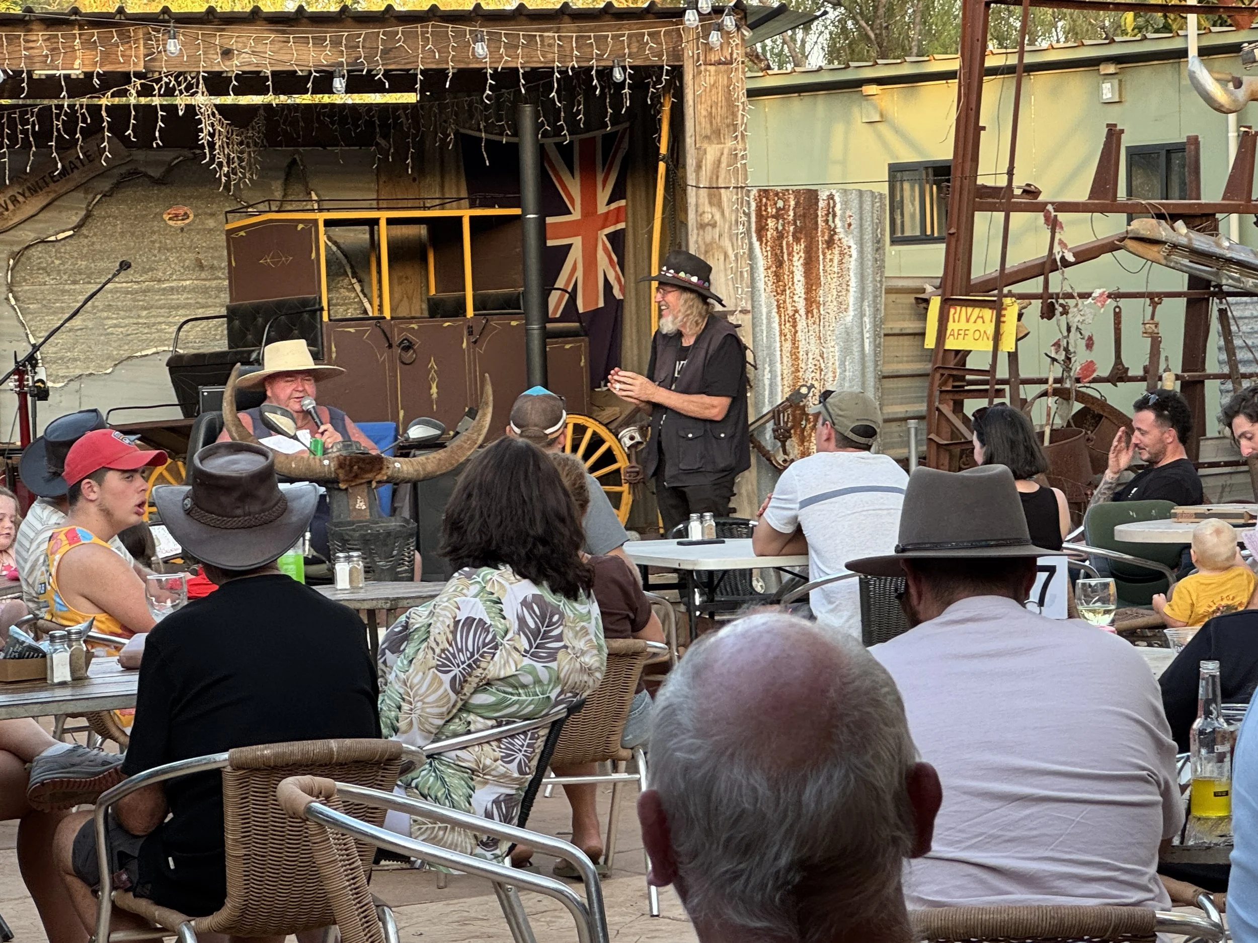 Tim Carter, the enterprise’s owner since 2017, was zipping around in a scooter with buffalo horns attached to the front and gave a half hour talk before the dinner service telling a large patio full of fascinated guests the story behind this iconic oasis.