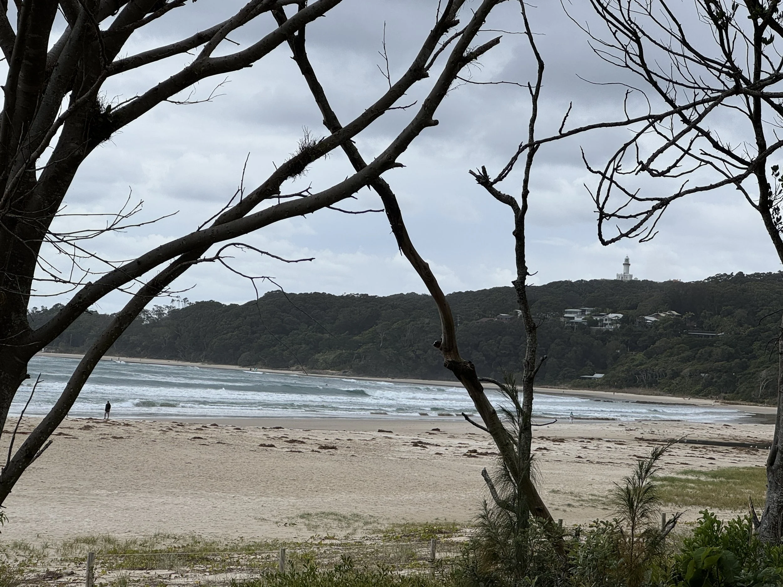 Arriving in Byron Bay, I was immediately captivated by its picturesque crescent shaped, pink and tan colored sandy beach, beautifully framed by tall, elegant eucalyptus trees in the foreground and brush covered rolling hills behind. Light blue and green waves gently rolled onto the surf with white frothy water at the edge.
