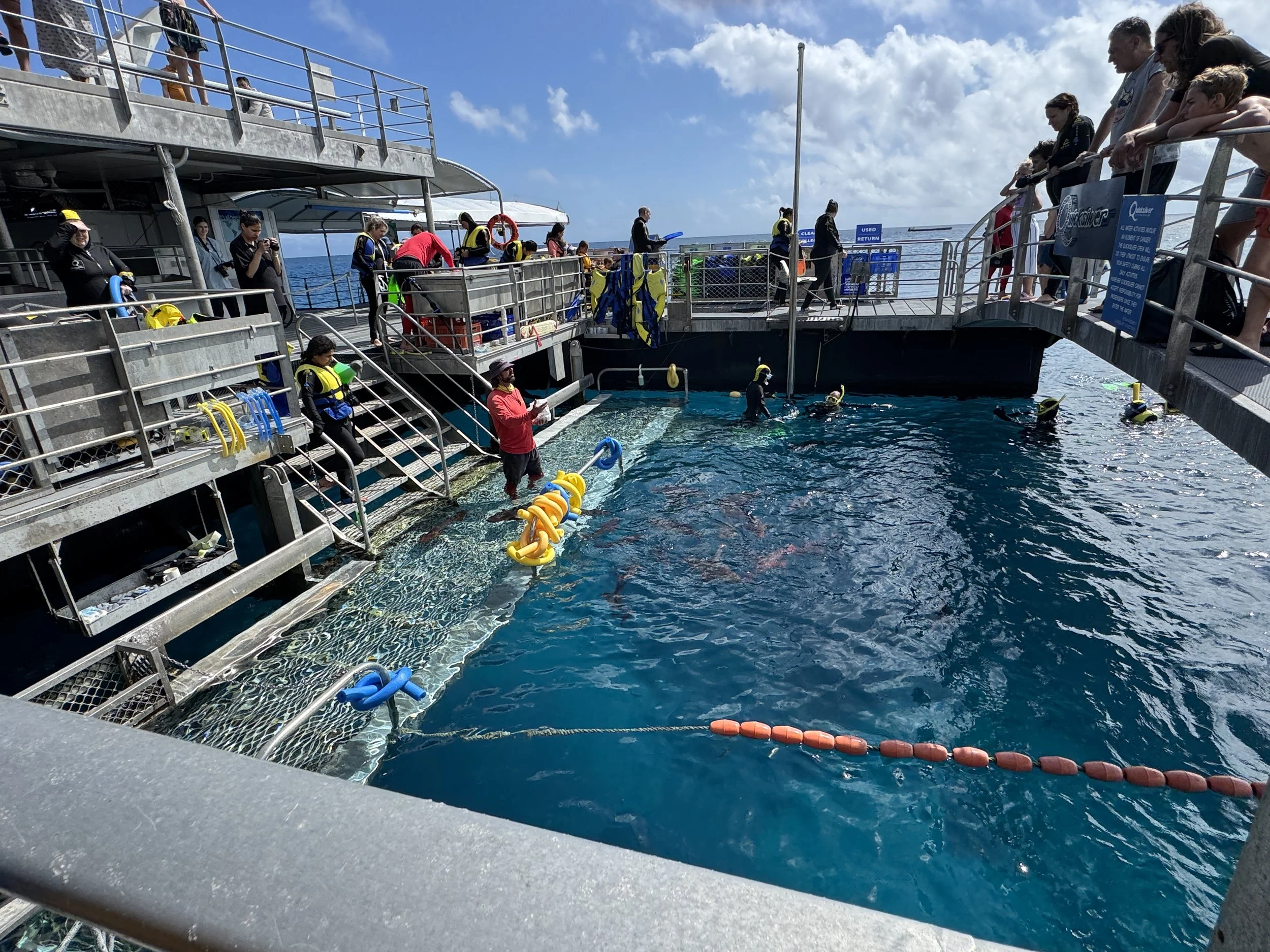 After disembarking, I slipped into a wetsuit to explore the reef at the water’s surface with my snorkel and mask. Lowering myself from the ship’s large, grated platform, I swam between colorful large red fish and watched schools of shimmering small blue ones flit by in the warm, light-colored water.