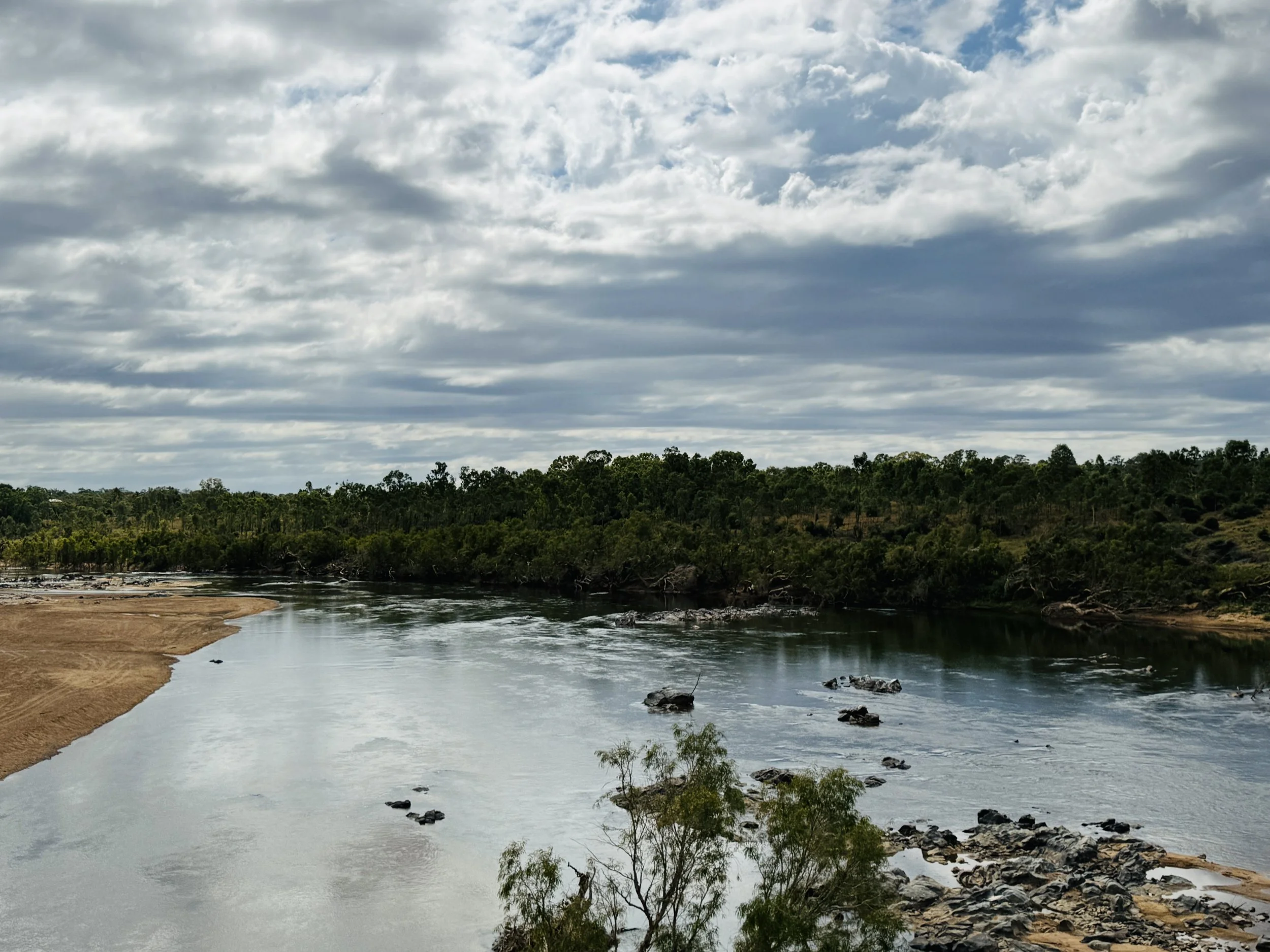Riding east towards the coast today, the landscape became hillier, with beautiful blue mountains to the south, framed by bright green gassy farmland in the foreground. Crossing the Burdekin River just past Charters Towers, I could see velvety silver blue waters rippling past rocky outcroppings, a far cry from the mostly dry red sandy riverbanks I have been passing the last several weeks.