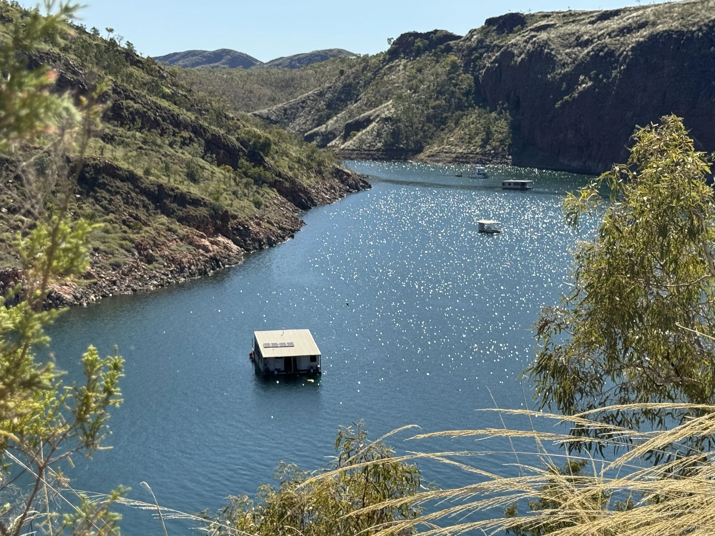 Reaching the crest of the overlook, I took in the broad sweeping vista of Australia’s largest lake, formed by damming the Ord River. This freshwater reservoir in the northern territory in the East Kimberly Region is popular with tourists for boating and fishing and offers beautiful views of shimmering blue water nestled in the cleft of the foothills in the otherwise arid landscape.