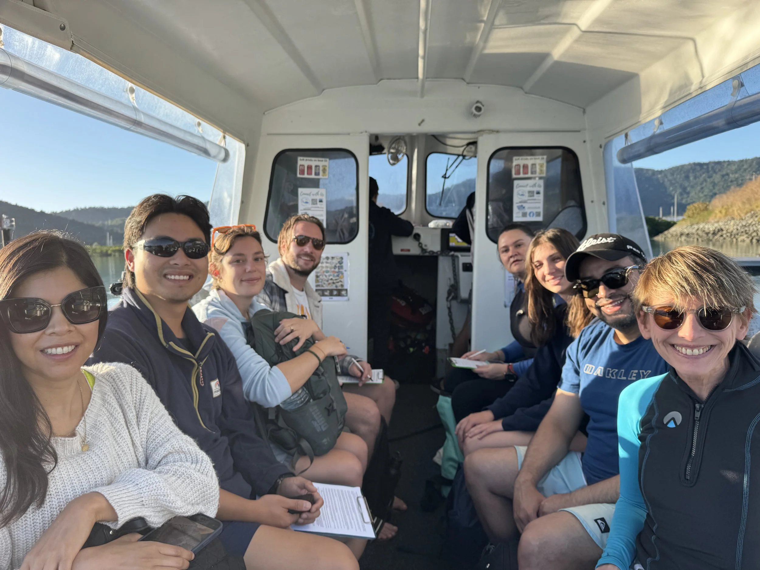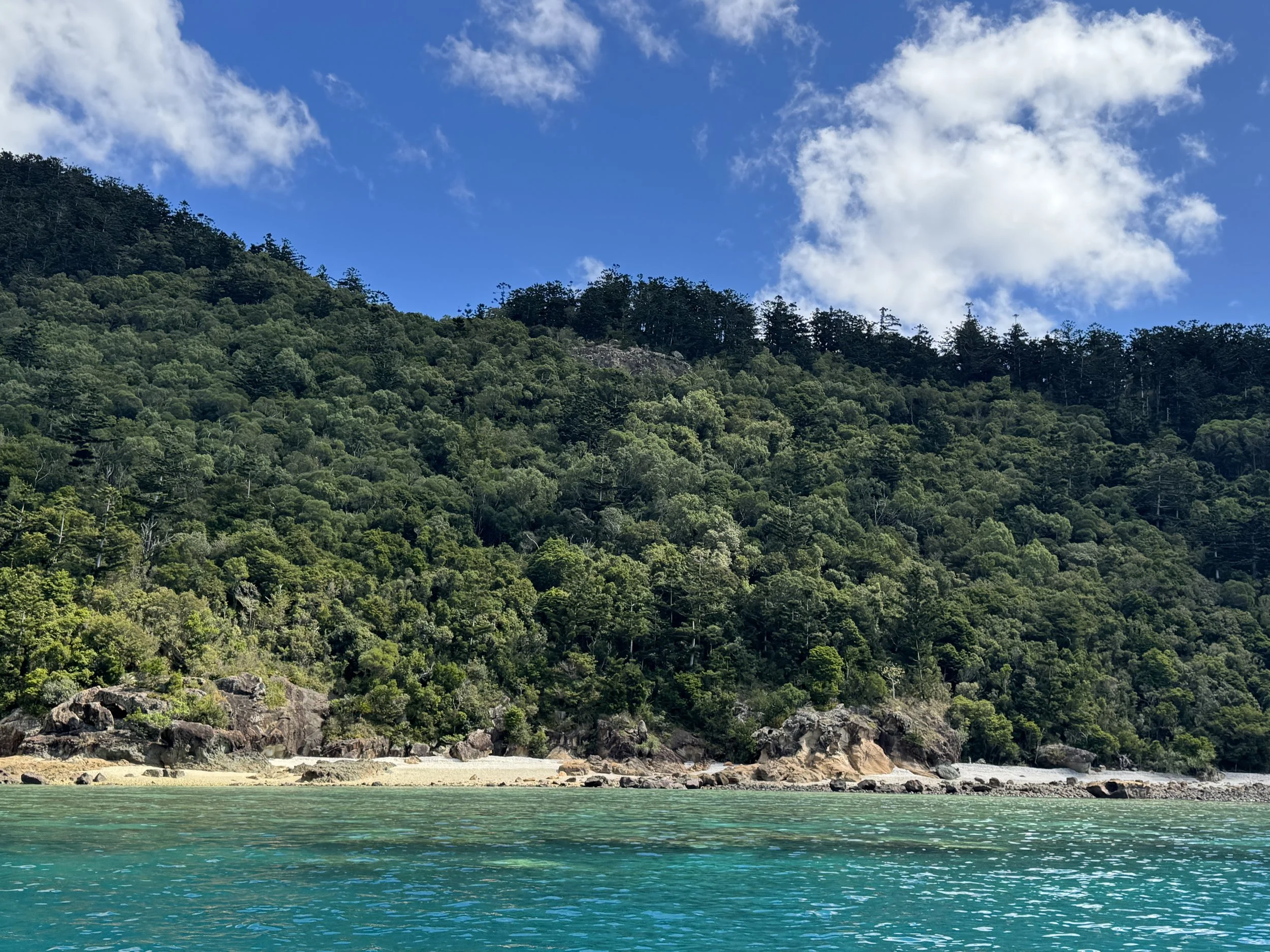 Our small group of eight divers met at the Airlie Beach Boat ramp at 7:15 in the morning and headed out shortly thereafter for a 50-minute ride to Butterfly Bay. With the sun low in the sky and the cool breeze on our faces we skimmed above the waves under bright blue skies with puffs of white clouds watching the sun rise in the sky. Lush green clusters of tree-covered land masses appeared on both sides of us, sporting rocky brown cliffs and light-colored sandy beaches at their bases.