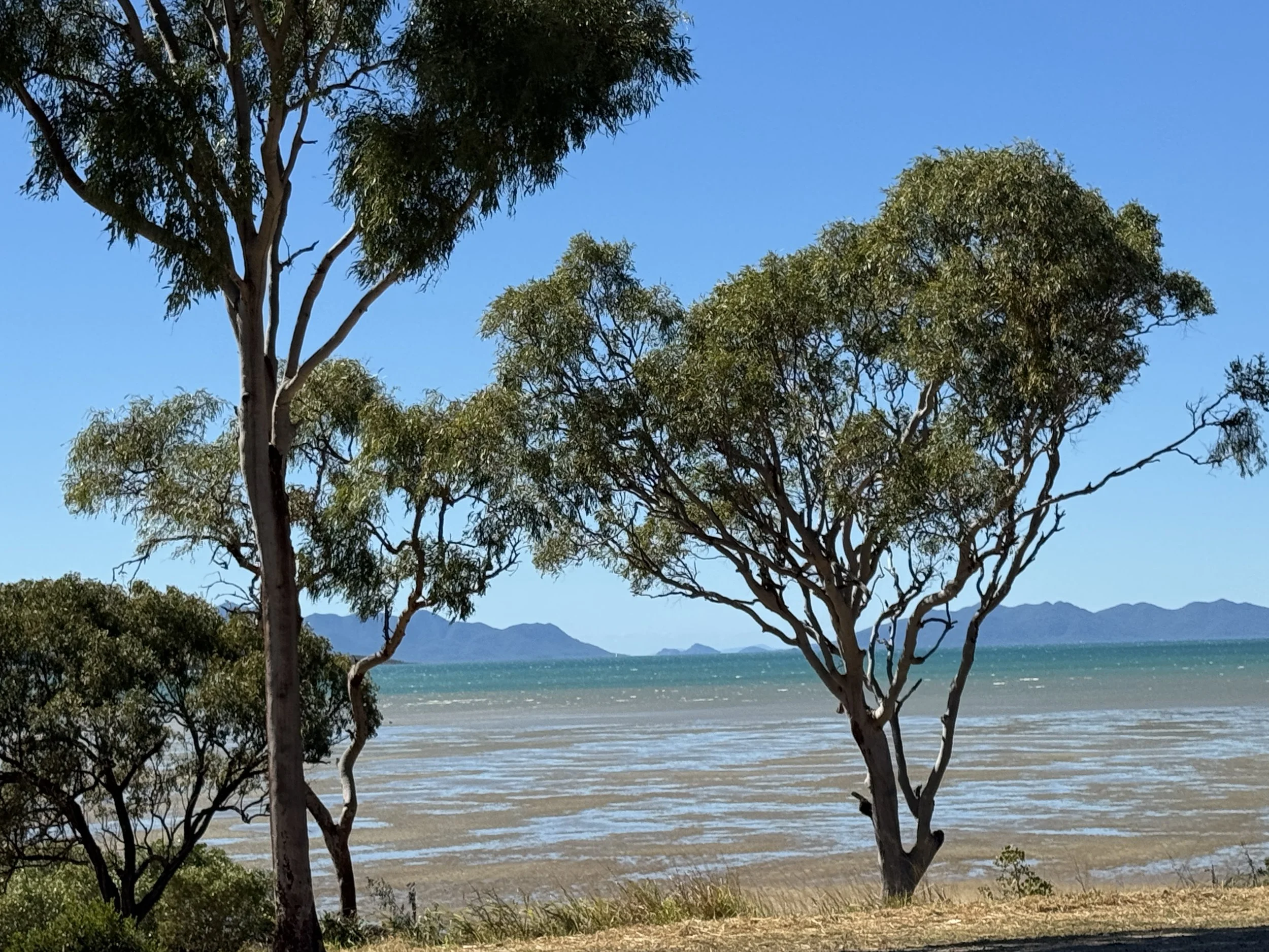 Reaching Bowen, I pulled the bike off to the side of the road and gasped at the breathtaking palate of colors to my left. Tall, grey trunked eucalyptus trees topped with olive colored greenery created beautiful silhouettes against the clear light blue skies above, dark blue rolling foothills in the horizon, turquoise-colored waters of McCanes Bay just beyond, and the light brown and honey colored sandy beach covered with rippling clear water in the foreground.