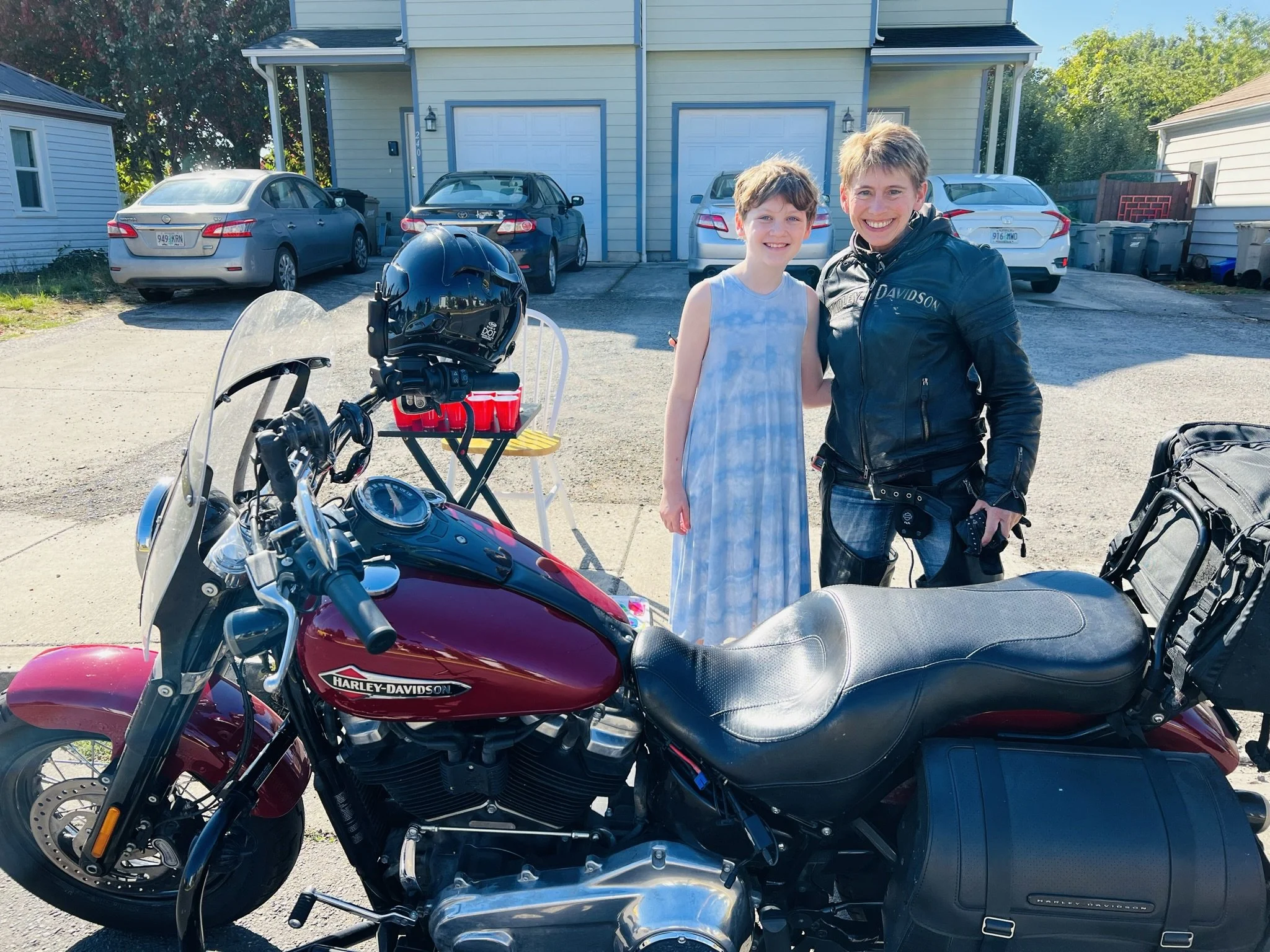From Stayton I took the Stayton-Scio Road and then highway 226 to Lebanon towards Brownsville. As I did not have plans to travel far today, I took my time enjoying the countryside and the ride itself, swooping around the corners and up and down hills as I passed animals grazing in the fields beside me. In Lebanon, I stopped to buy Kool-Aid from an enterprising child with a stand on the road and took a picture of the two of us with my bike.