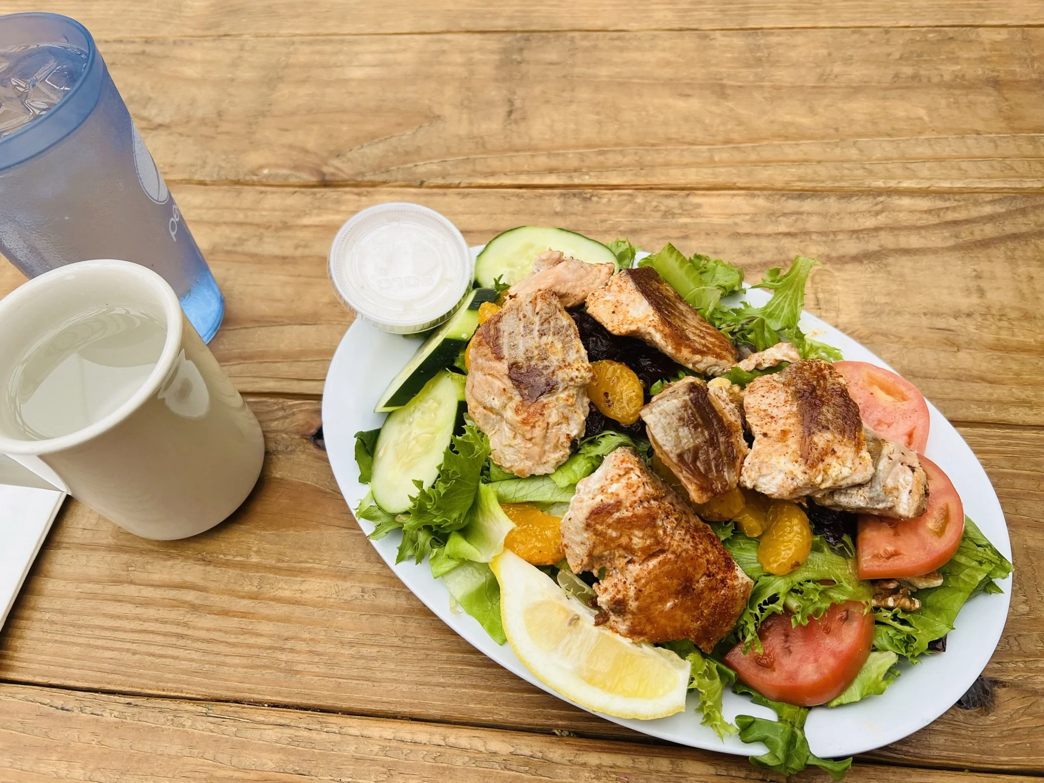 I ordered a grilled fresh salmon salad with mandarin oranges, cranberries, walnuts, tomatoes, and cucumber with a side of ranch dressing. The serving size of the salmon was generous and the fish itself was moist and flavorful. I asked for a cup of hot water to go with my meal as the temperatures on the coast were markedly cooler than inland.