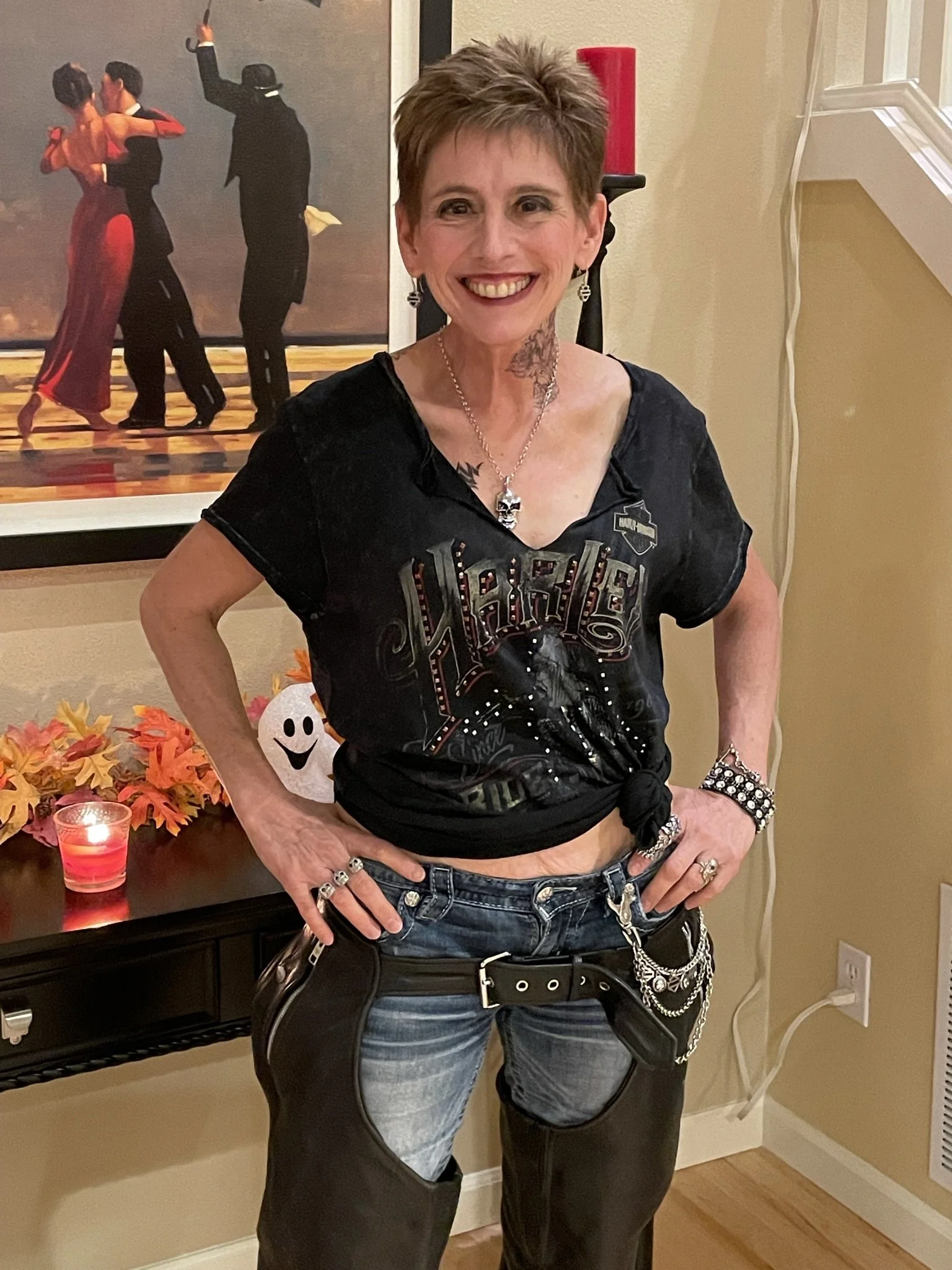 As I crested the hill at the top of my road on my way home, the setting sun cast a pink glow on the snow-capped vista of Mount Hood in the distance, framed by the pink, orange and yellow leaves in the foreground. What a treat! Rushing home, I tatted up (temporaries!) for a Halloween party where I appeared as a biker chick, complete with dark make-up, skull jewlery, spiked hair, and tattoes all over my neck, back, lower back, chest, and arm. Life is so good!
