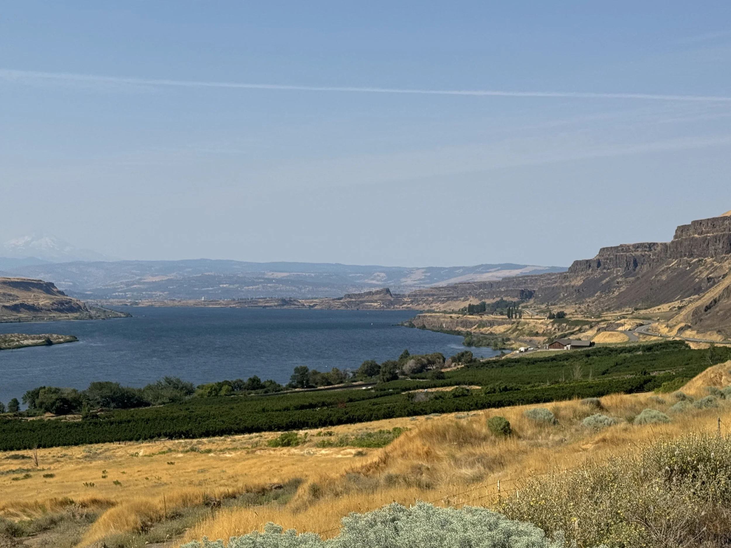 As I passed Skamania, North Bonneville, and White Salmon, the surrounding landscape became more arid, with bright yellow scrubby grass and dark brown plateaus replacing the verdant green rolling hills, providing a beautifully stark contrast to cool blue waters nearby.