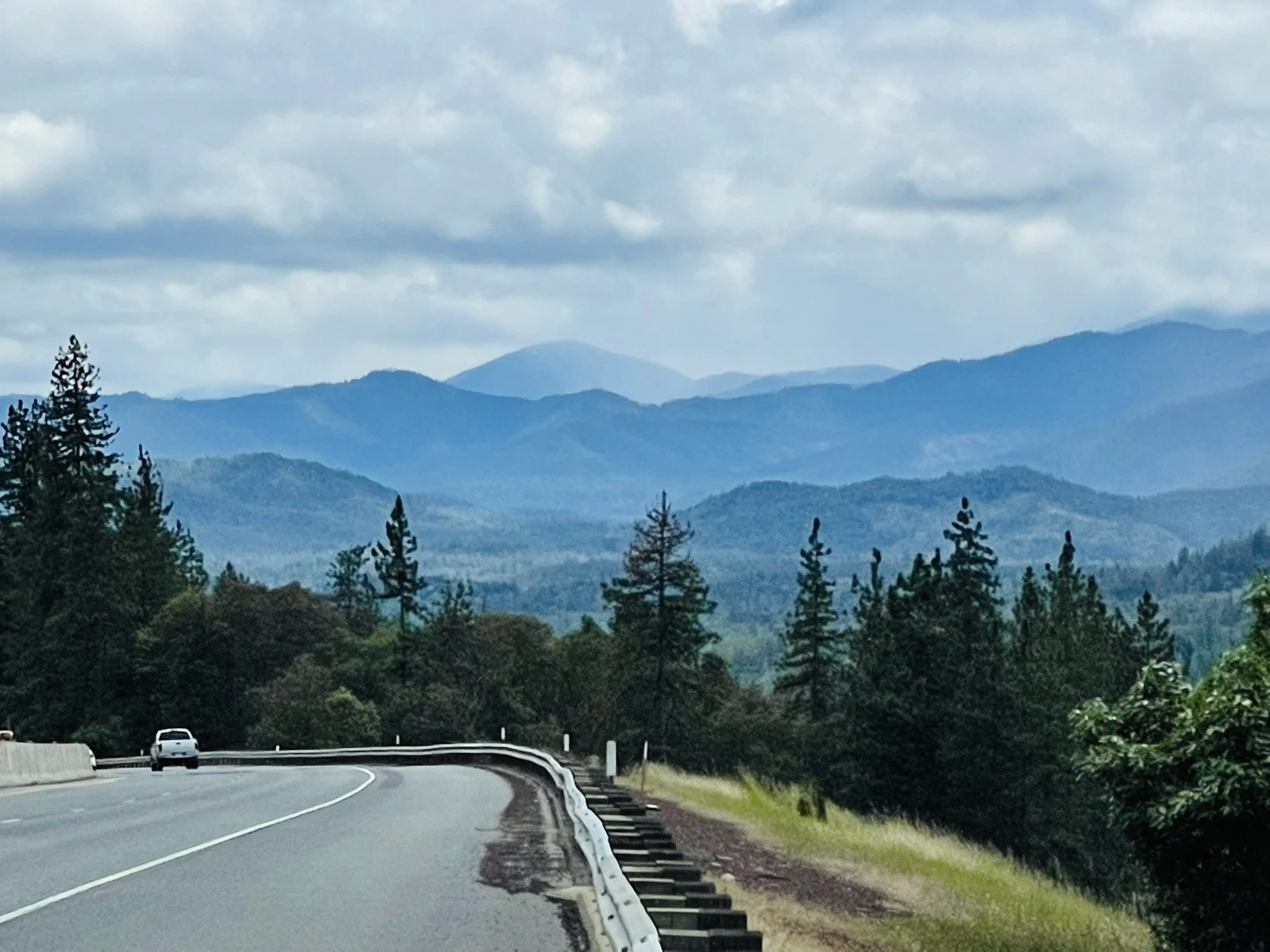 I decided to take interstate down to Grants Pass so that I could enjoy both my favorite bakery in Creswell and the In-N-Out Burger down south. My favorite part of this interstate starts right before Creswell and continues down to the California border. The road curves and undulates through several mountain passes providing stunning valley views and magnificent mountain vistas. As I passed over Stage Road Pass and Smith Hill Summit, I breathed in the fresh mountain air and marveled at the rich green foliage and striking black and blue skies.