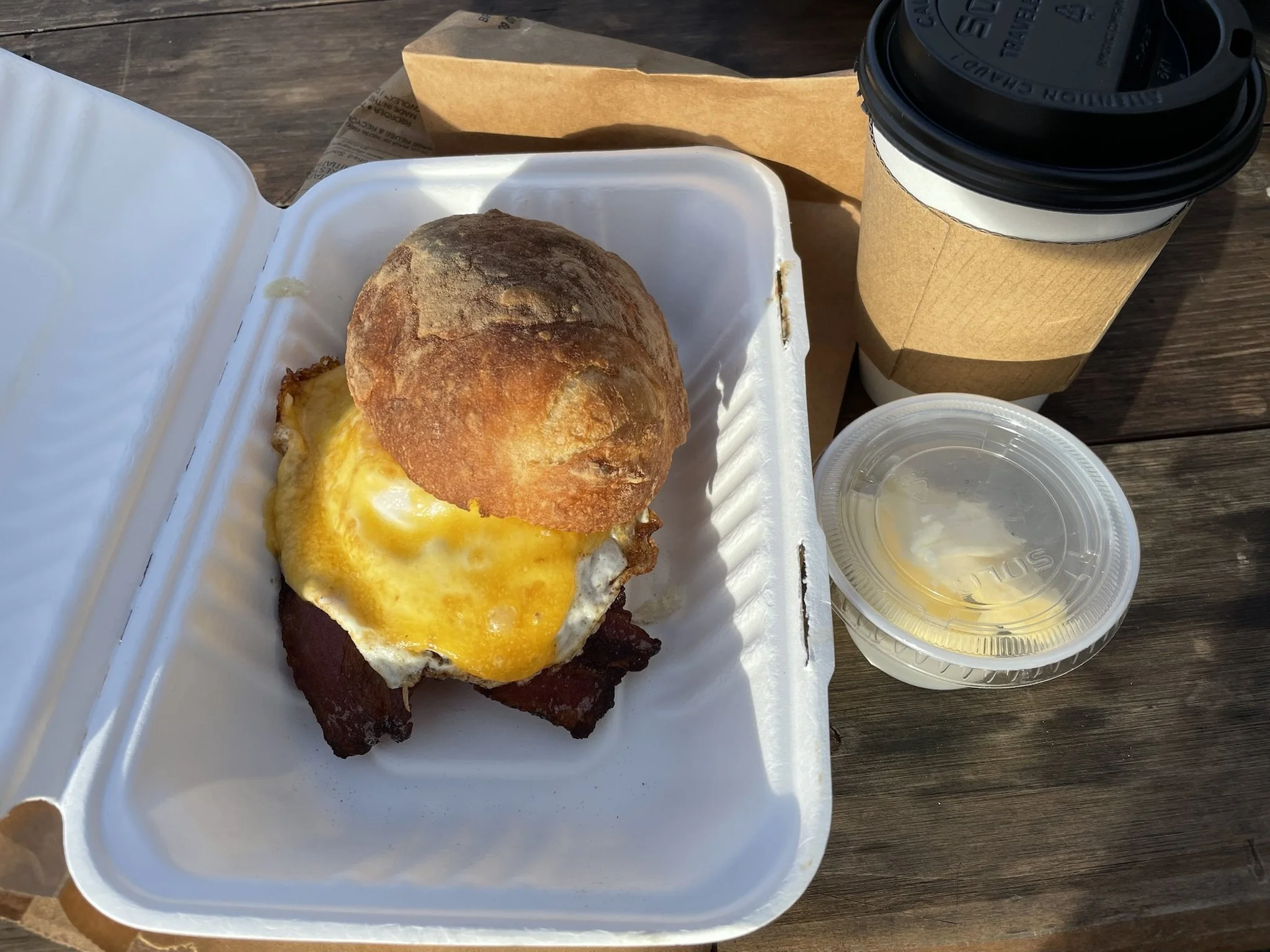 I was glad I had called in my order ahead of time as they bakery had sold out of bread when I arrived but had set aside two loaves of multigrain sourdough for me. My bacon ciabatta breakfast sandwich was as good as I remembered with an over easy fried egg, fresh Tillamook Cheddar Cheese, and house-cured bacon on a homemade ciabatta roll. I savored every bite as the bakery just recently began making these sandwiches again after months of labor shortages.