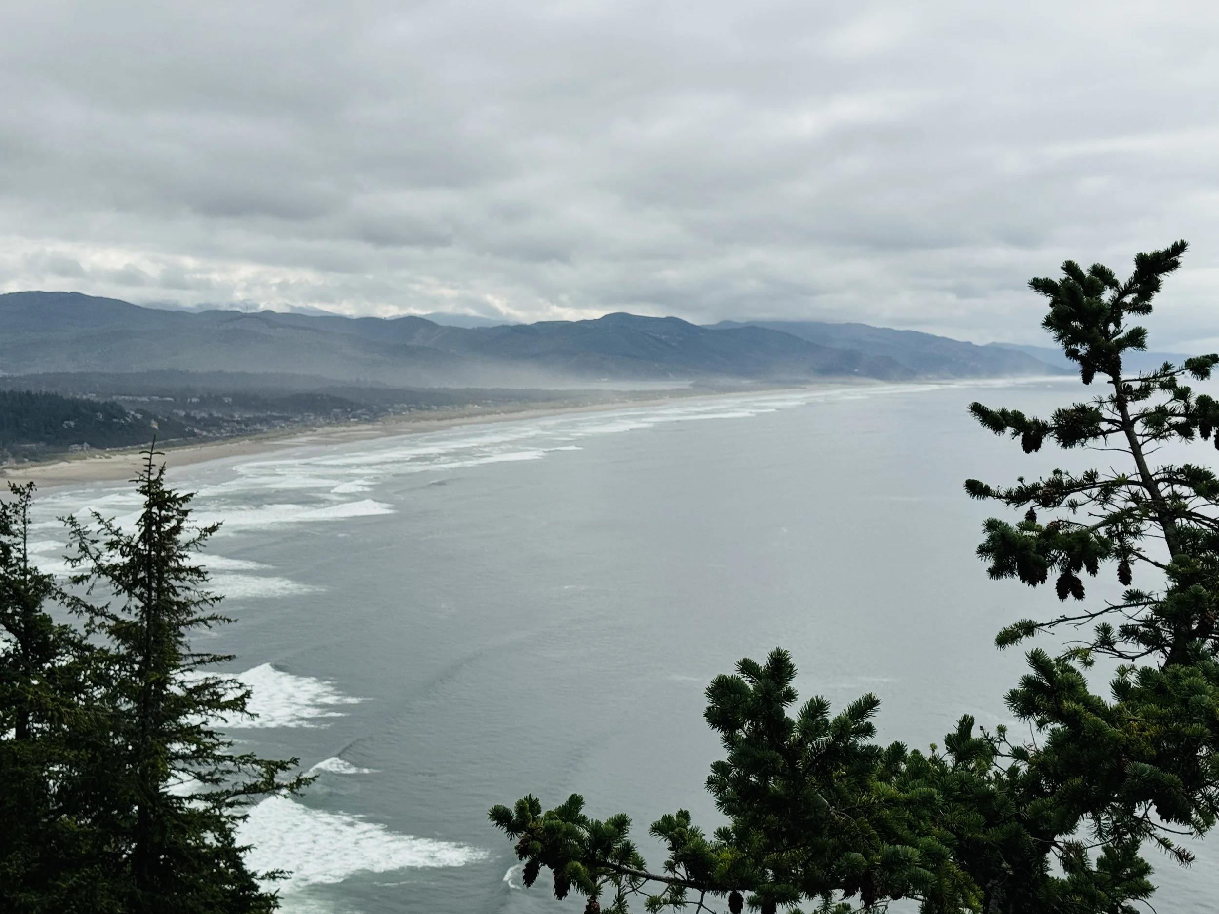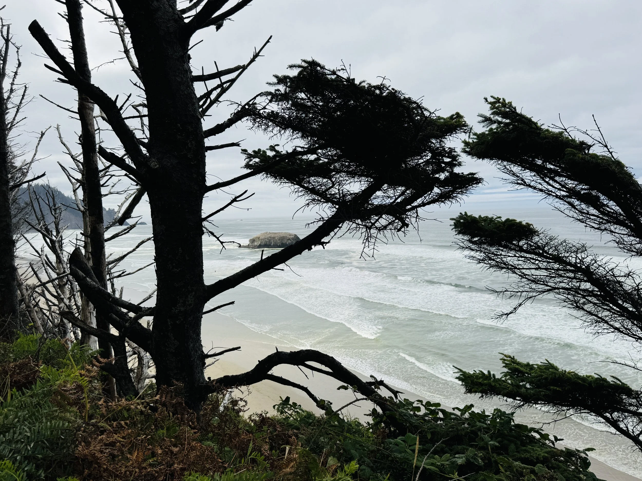Following the shoreline south, I took in the broad sweeping views of the Pacific Ocean to my right, a serene, muted shade of blue in the still somewhat foggy air. Stopping at Arch Cape I peered out at the rocky promontories, rolling white-tipped surf, and rugged cliffs topped with tall dark trees, their branches creating stark silhouettes with the light sky beyond.