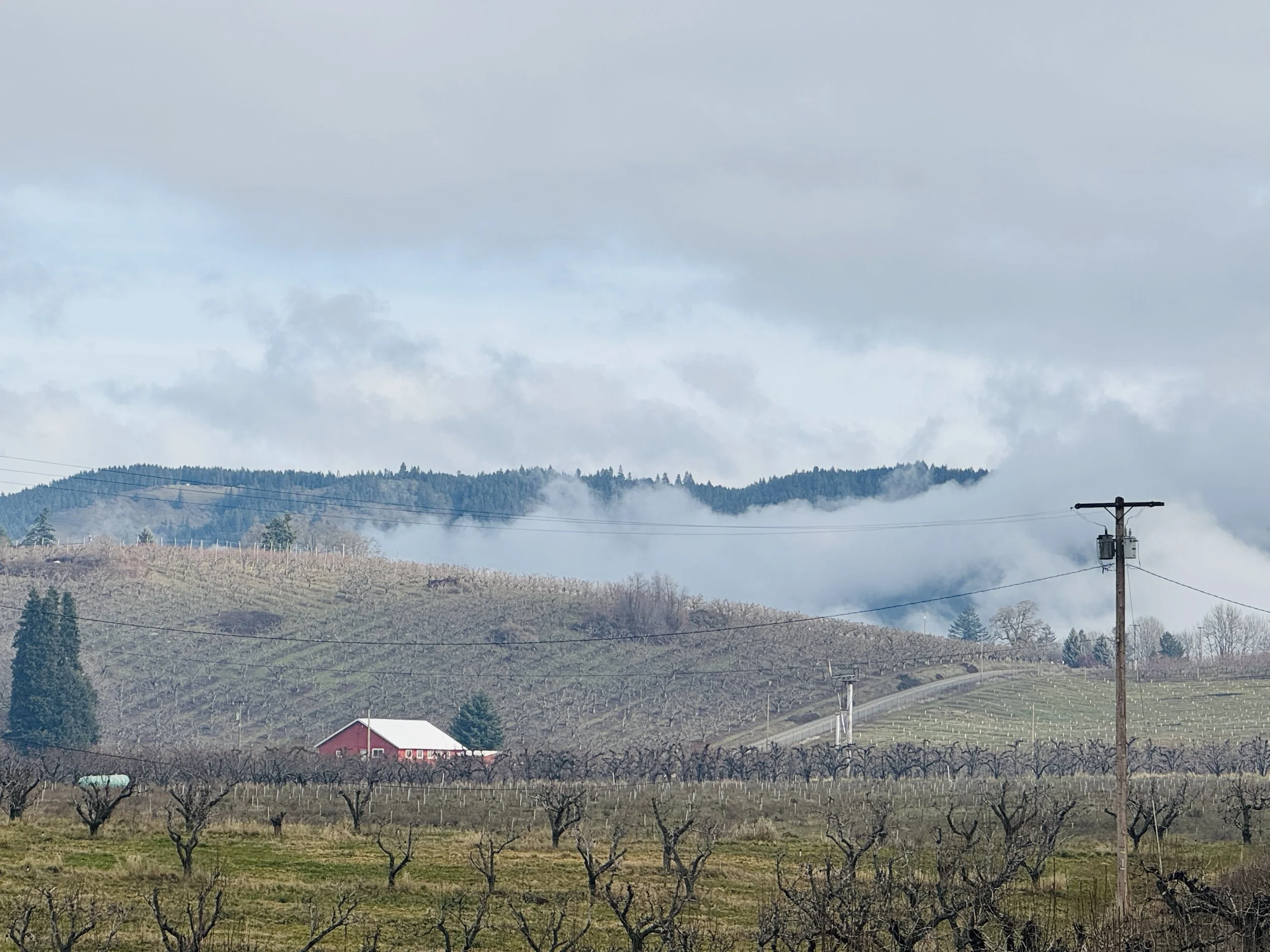 Descending into Hood River through orchards of pear, and cherry trees, generous wisps of white mist floated over the vineyards and fields and rolling green foothills, creating an ethereal feel to the chilly winter day.
