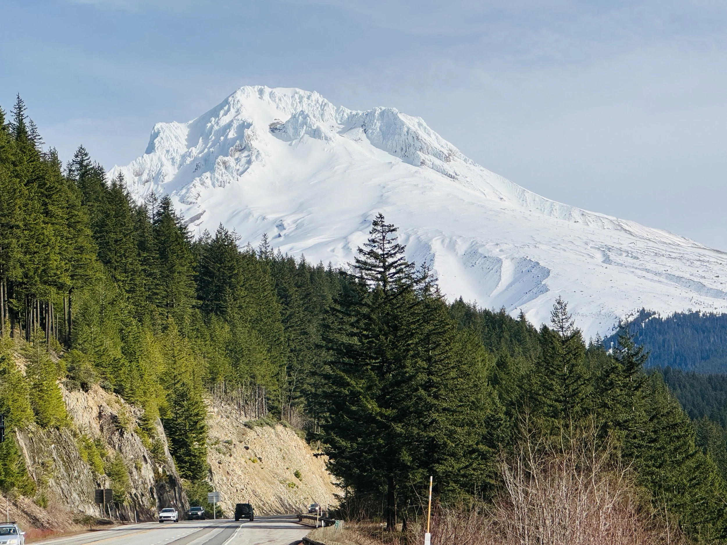 Rising in elevation on highway 26 near Government Camp, my breath caught in my throat when the massive snow covered top of Mountain Hood rose up into the sky before me, its icy white rugged peak framed by the cascading hillside of dark green evergreens in the foreground and baby blue sky beyond.