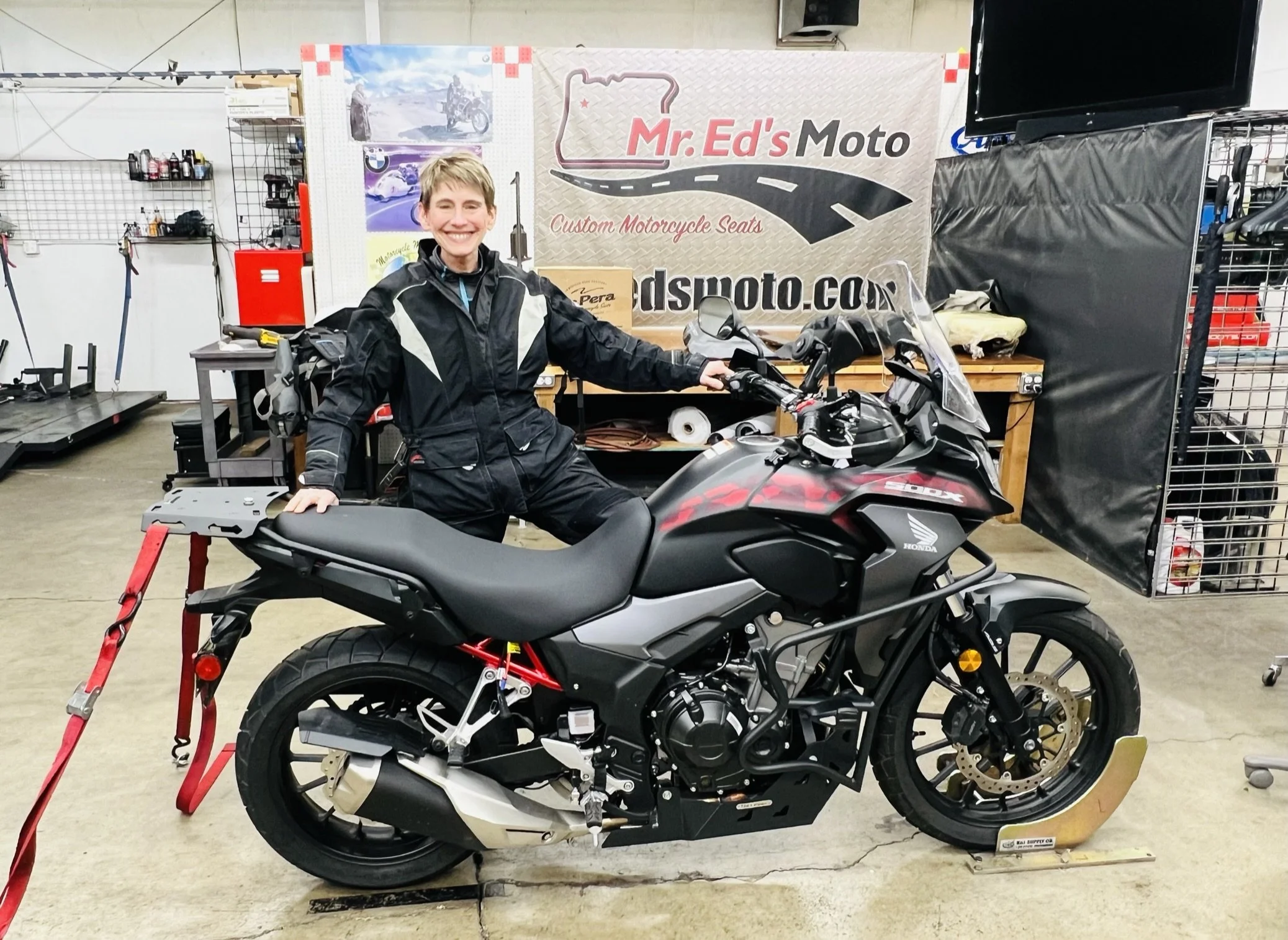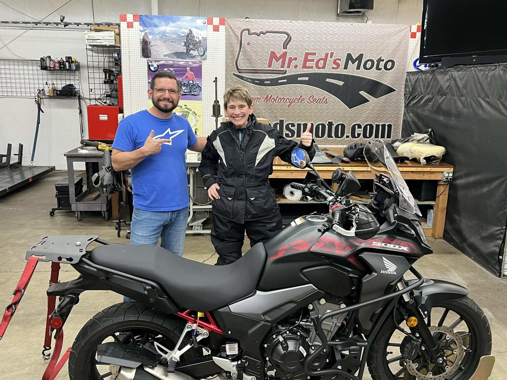 Today I headed south to Mr. Ed’s Moto to have Ryan Denno create a new seat for me out of the one that came with the bike, making it possible for me to be even closer to the ground as well as to the front of the bike. Ryan left the existing seat pan but removed some of the factory foam from the middle and front of the seat. He added some high-density memory foam and a top layer and then put the old seat cover back on. With the lowering links and new seat, I am now able to rest both feet lightly on the ground and push off firmly from the balls of my feet. Victory!