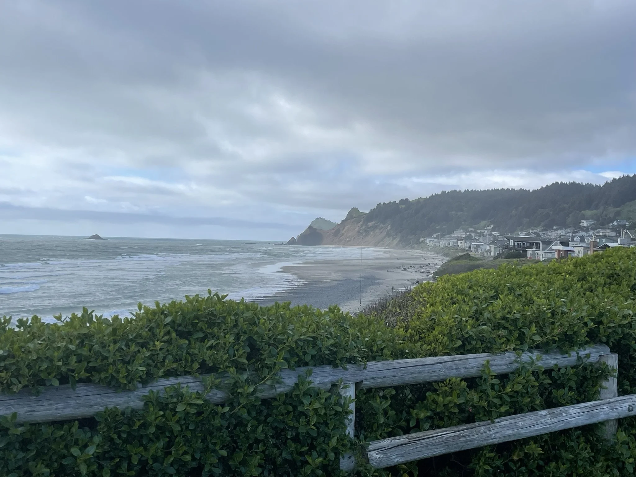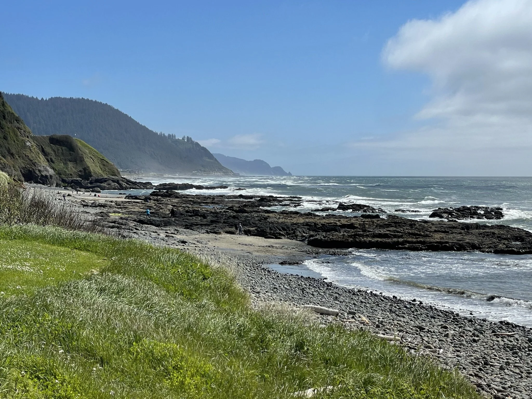 From Yachats we headed north to Lincoln City to enjoy more spectacular ocean views, this time at Roads End State Recreation site. The wind had picked up at this point and the air was cooler. But we were able to keep warm with all of our layers and enjoy the incredible view – vast sandy beaches framed by rounded pebbles, driftwood, and beach cottages. It was wonderful to spend the day with Teresa and to enjoy the coast together.