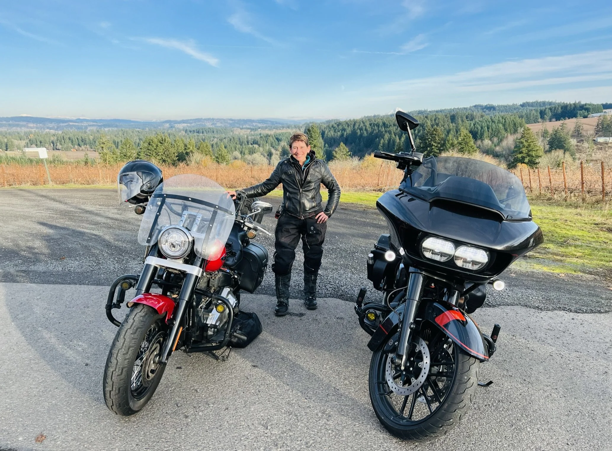 Leo Guzman Fernandez and I left Volcano Harley this morning and headed west through Oregon City and across the Willamette River on the Oregon City Arch Bridge. I am always inspired by the view there of the voluminous Willamette Falls cascading over the rocks and into the water, sending up sprays of sparkling mist across the full width of the waterway. We followed the river west and turned onto Stafford Road and then Wilsonville Road, winding through beautiful orchards, vineyards, and Christmas Tree Farms.