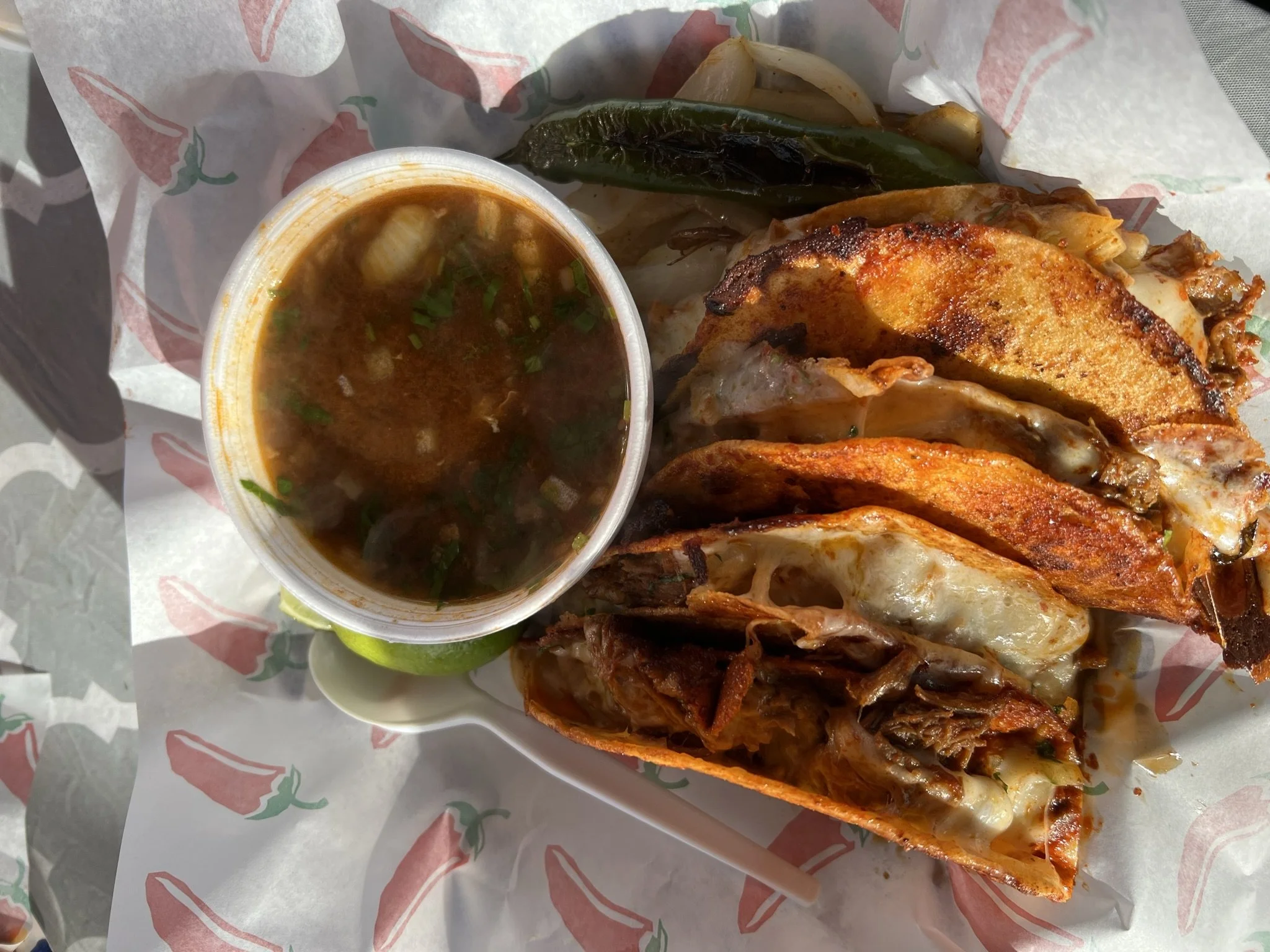 Lunch at La Pachanga Mexican Food Truck in Aloha was superb. I feasted on the Barbaqueso Plate – four grilled corn tortillas stuffed with marinated barbacoa meat and creamy mozzarella cheese topped with grilled onions and accompanied by a savory consume. The dish is spectacular because of the tenderness and flavor of the meat as well as the trio of textures – the crispy tacos, creamy cheese, and tender meat is hard to beat. What a great day!