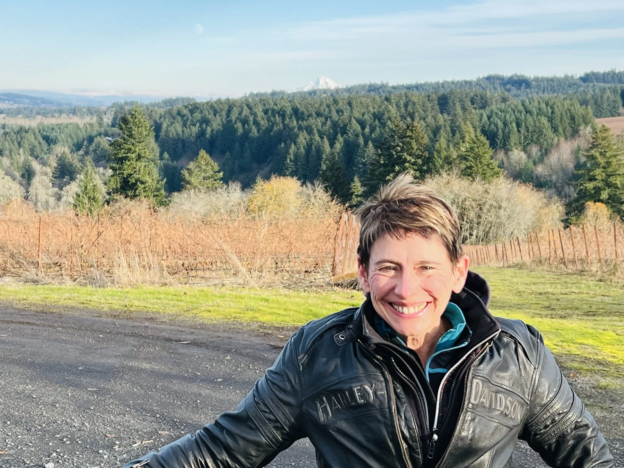 In Newburg we headed north on highway 219, following one beautiful tight turn after another through the forest and up to a ridgeline in the Chehalem Mountains with stunning valley views to the east of light green fields, grapevine-filled vineyards, and evergreen-covered rolling hills. As we headed through the Laurelwood district just 15 minutes north of Newburg, my heart leapt with joy as I gazed across the valley at three snow-capped mountain peaks in a row – Mount Jefferson to the south, Mount Hood directly east, and Mount Adams to the north. What an amazing treat!