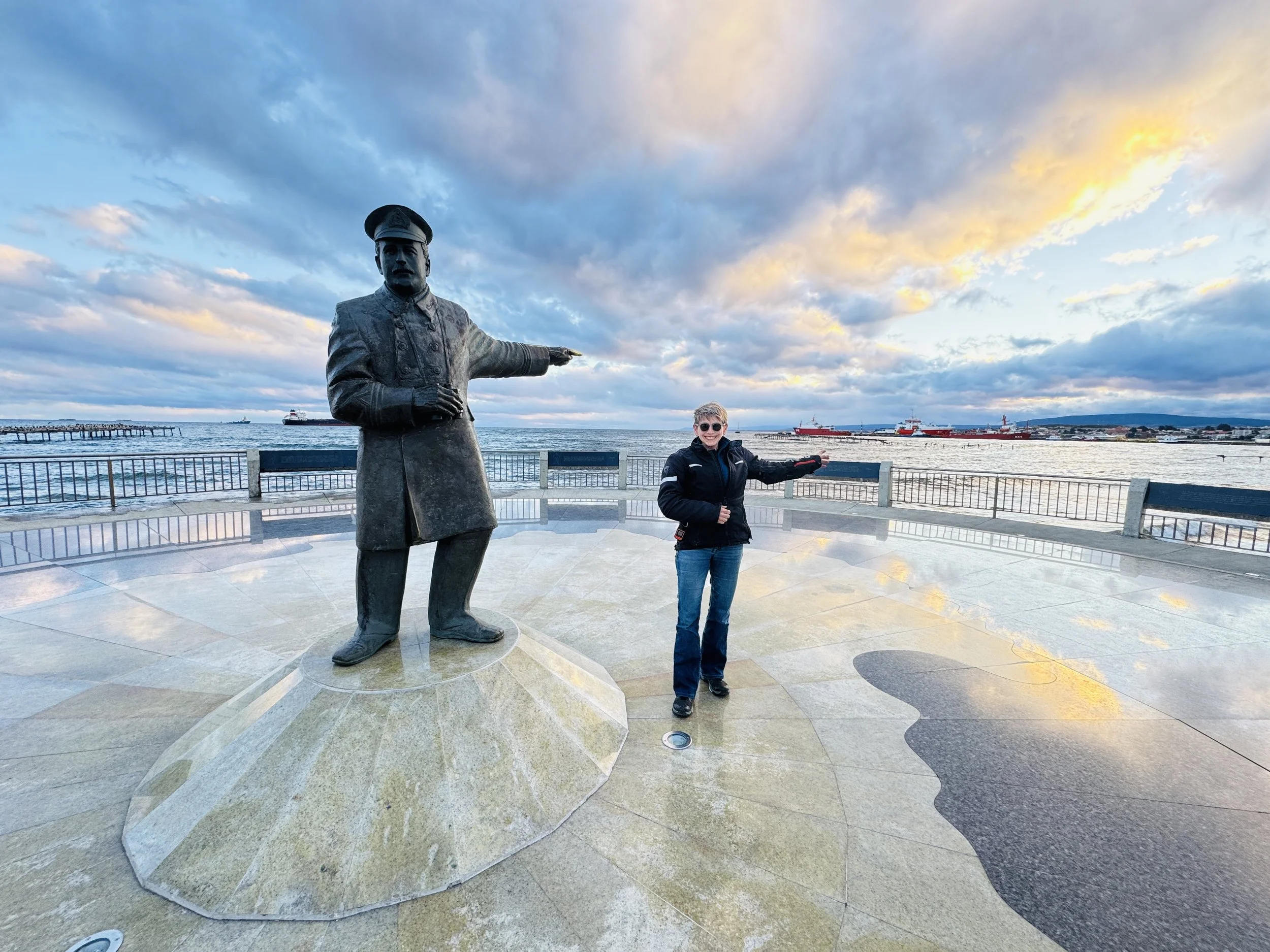 Note: The statue in this picture depicts Luis Pardo Villalon, a Chilean naval pilot and maritime hero, pointing towards Antarctica where he courageously commanded a rescue mission to successfully rescue 22 members of the British Endurance Expedition after they became stranded when their ship was crushed by sea ice.