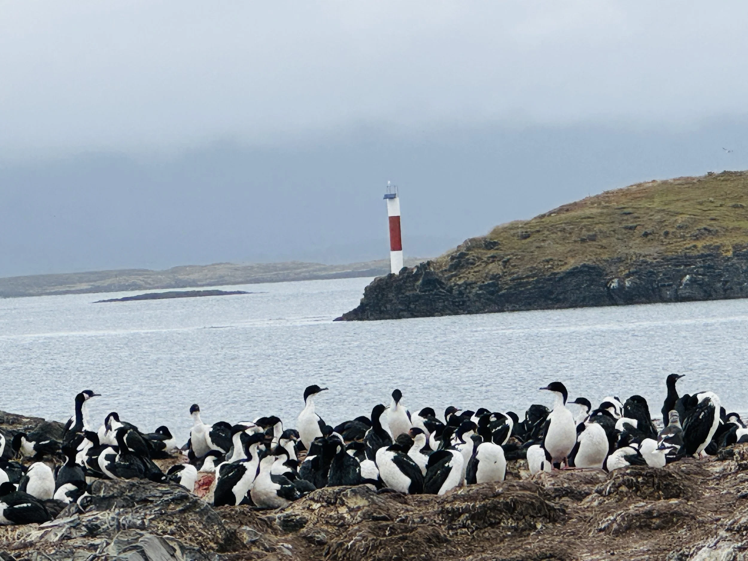 Traveling in the narrow strait between Argentina and Chili with snow dusted mountains all around, our first stop at the Pajaro Islands gave us an up-close look at a colony of black backed and white chested cormorants, resting, preening, and huddling together on the scrubby brown rocky surface. Others took flight in the air and swam in the choppy surface nearby.