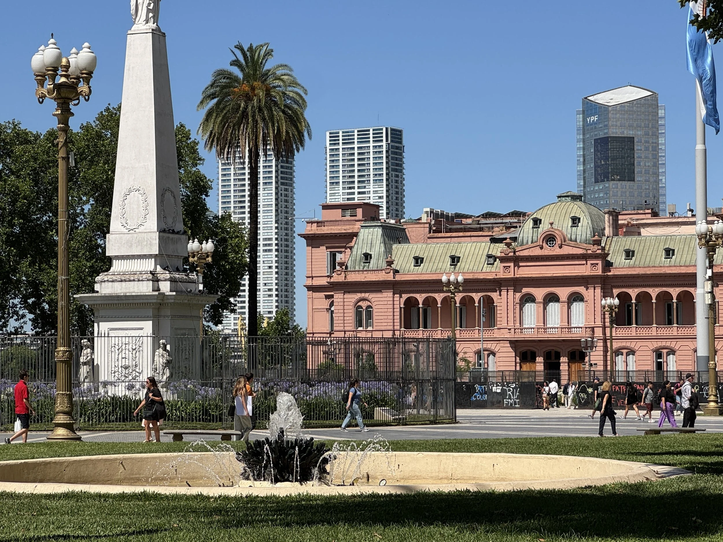 This civic and colonial square featured the iconic pink-hued Casa Rosada, the seat of the Argentine Presidency, with a lush green lawn and multiple water fountains in front. Equally striking across the street was the El Cabildo de Buenos Aires, an old colonial town council building sporting arched doorways and a silver turret shining in the sun.